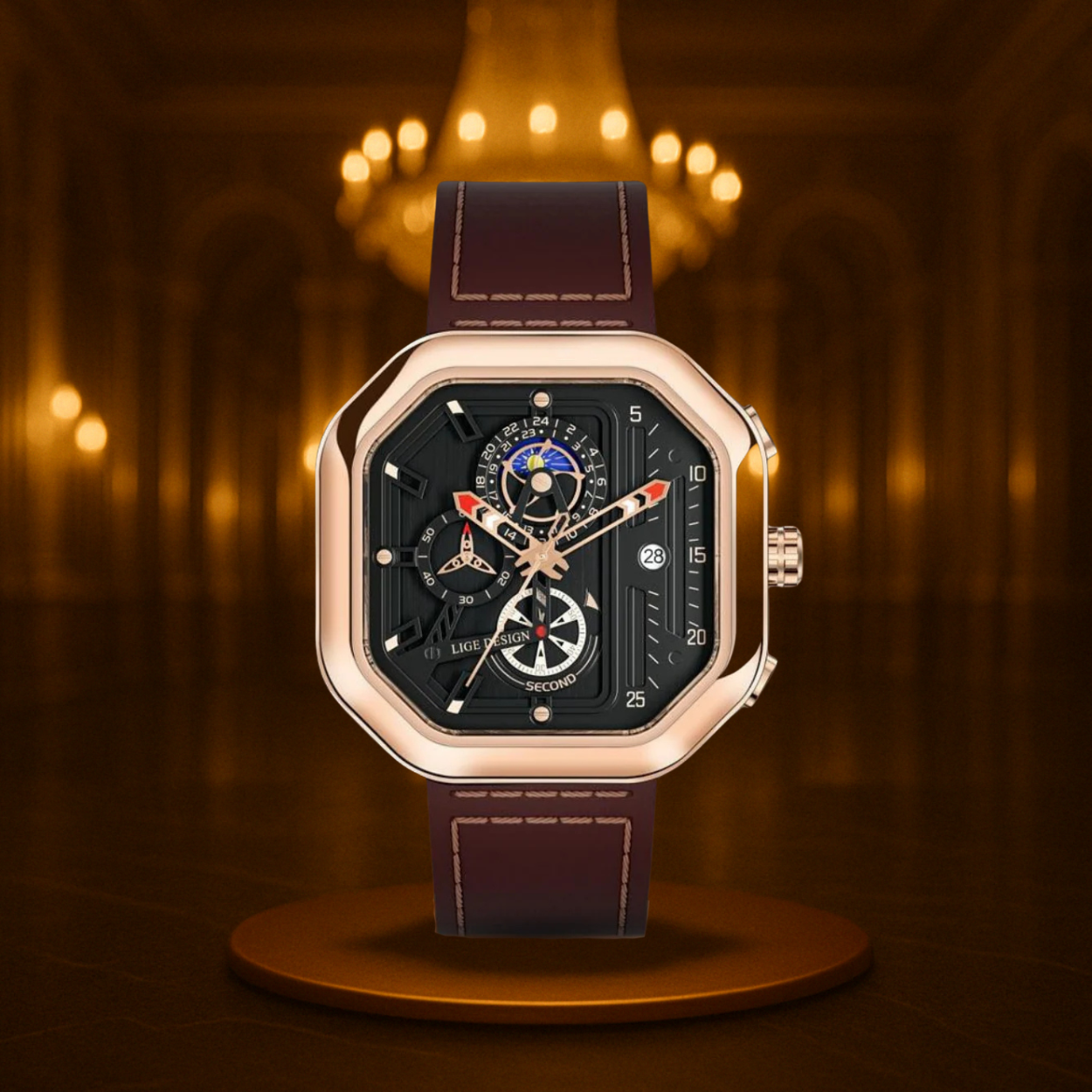 - Chronograph Function: Includes a calendar and moon phase display for added functionality.